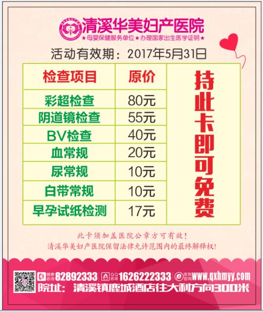 ★三八节1+1姐妹礼:3月5日-3月12日活动期间,凡女性到院做妇科疾病检查,每项检查费用仅收半价。同时,一人妇检惠及亲友(例如:陈女士在华美做了妇科疾病检查,那么,按活动半价缴费后,即可获得一张免费妇检卡。陈女士可将此卡送给朋友、同事或家人,其家人可凭此卡到院做免费体检,此卡的免费检查项目包含:彩超检查,阴道镜检查,BV检查,血常规,尿常规,白带常规,早孕试纸检测。)